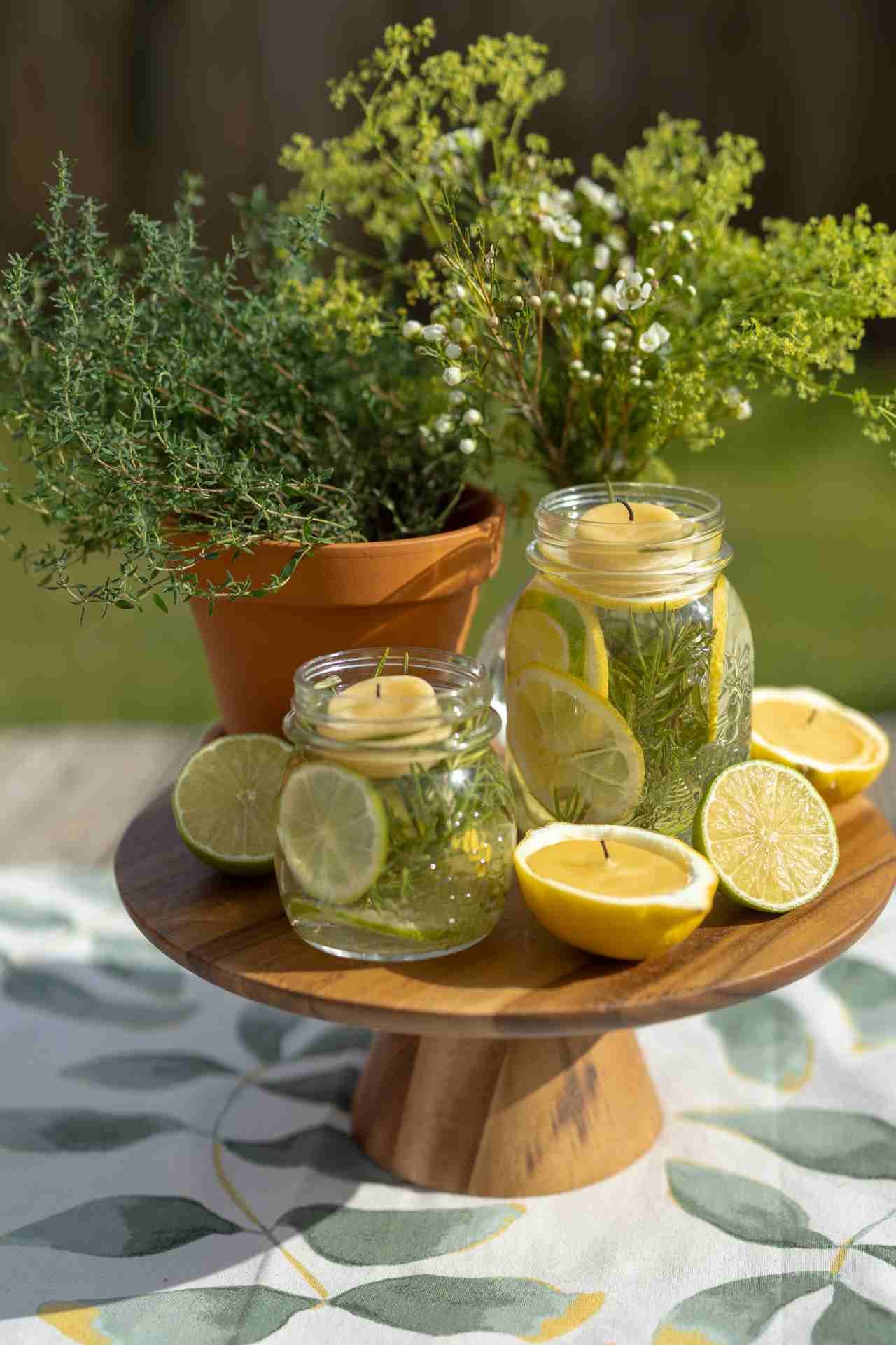 Mit selbst gemachten Kerzen in Zitronenhälften, einer Kräuterpflanze und Gläsern mit Zitronen-, Limetten- und Rosmarinscheiben duftet es am Tisch herrlich sommerlich.