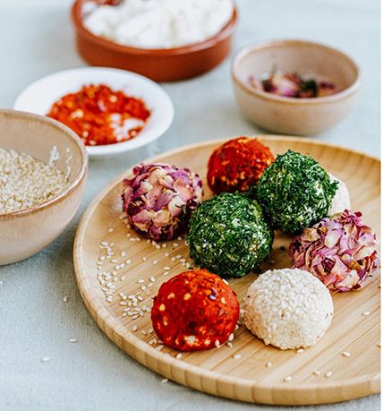 - Jeweils ein Drittel der Labneh-Kugeln durch eine der Schalen rollen, bis sie vollständig mit Kräutern oder Gewürzen bedeckt sind.